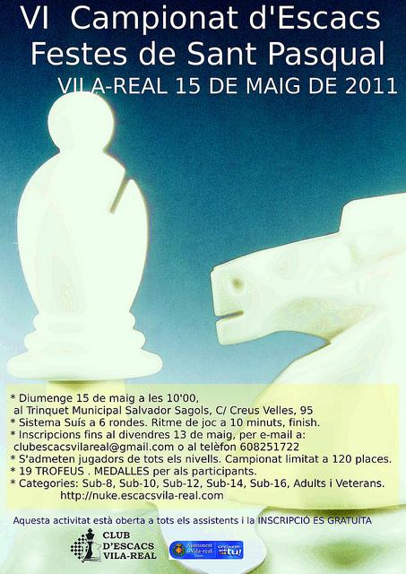 El proximo Domingo dia 15 de Mayo, se celebra en el Trinquet Municipal Salvador Sagols, sito en la C/Creus Velles nº 95, el VI Campionat d´Escacs Festes de Sant Pasqual, de Vila-Real.
