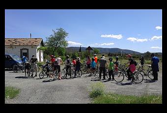 Personalmente pensaba que la duración de la actividad iba a ser menor, pero claro no había considerado todas las contingencias acaecidas en un grupo de 24 ciclistas: caídas, salidas de cadena, ajustes de bicicletas, etc.Pero todas esas tardanzas se compensaron con la no necesidad de pedalear en la mayor parte del trayecto, ya que el mismo discurre todo de bajada.Así que la actividad se convirtió en un slow-cicloturismo, donde cómodamente disfrutamos del entorno, hasta llegar a Navajas.Dispusimos además de un guía, Juan, que participó en la conversión de la antigua vía de ferrocarril en Vía Verde, y que nos amenizó el trayecto con paradas en una Carrasca centenaria, en bunkers de guerra, etc.