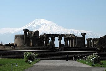A pesar de que una vez fue la primera y más grande catedral del mundo, hoy día solo queda lo que se ve. La montaña del fondo es el monte Ararat, donde quedó varada el Arca de Noé.