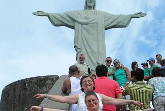Cristo Redentor en el Corcovado y foto de recuerdoTenemos suerte, la neblina que habitualmente cubre Río, empieza a disiparse, a nuestra derecha comienza a divisarse la Laguna de Rodrigo de Freitas, las playas de Ipanema y Copacabana, el Pan de Azúcar y la ensenada de Botafogo; a nuestra izquierda, el centro de Río, con el inconfundible estadio de Maracanã con forma de un gigante donuts o la estructura cónica de la Catedral, luego mas entrado el día, llegamos hasta divisar el puente y ciudad de Niteroi, en el otro margen de la Bahía de Guanabara.