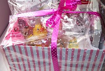 El regalo de bautizo fue una cesta de lunares y rayas rosas, que contenía: