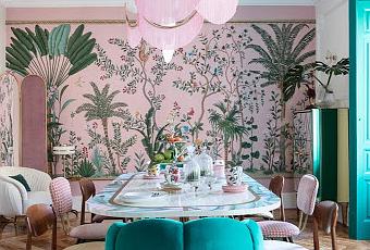 Toques rosas y verdes, flores, macro espejo cubriendo el techo lo cual le da ese ambiente cosmopolita, sofisticación y estilo glam, los textiles cuidadosamente estudiados, y esas lámparas de Masquespacio que nos tienen el corazón robado, tanto o más, que el papel pintado de Gournay con motivos vegetales y aves, sobre fondo rosa.