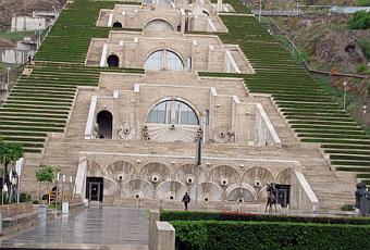 Monumento Kaskad (cascada). Iniciada su construcción para conmemorar los 50 años de la Armenia soviética, quedó sin finalizar cuando se separó de la unión de repúblicas. Posteriormente (hacia 2001) el monumento se terminó con un estilo mucho más "amigable". Es un sistema de pasos escalonados con fuentes y monumentos en cada planta. Sirve para unir peatonalmente una de las zonas altas con la zona baja de la ciudad, encontrando en su interior escaleras mecánicas y espacios para exposiciones. Hay una exposición permanente de piezas de cristal muy original pero de la que no se pueden sacar fotos.