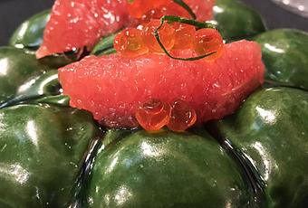 Las Sirenas está inspirado en el salón del mismo nombre. Germán confiesa que tiene predilección por este plato: rodaballo al pil pil, bizcocho aireado de algas, emulsión de codium, uvas de mar, tallarines semi-crudos de calamar, huevas de mújol, maracuyá, codium fresco y salicornia. Un plato realmente único.
