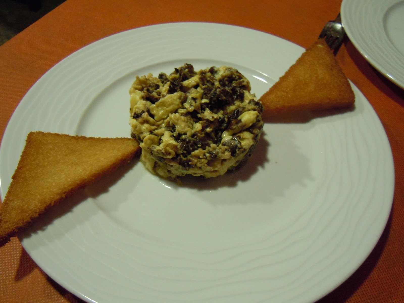 - Revuelto de morcilla y setas: La morcilla hay que decir que es del pueblo, tiene un sabor muy suave y agradable que junto a las setas y el revuelto en sí, estaba riquísimo. Nos lo presentaron con 2 panes fritos para empujar y no dejar nada.