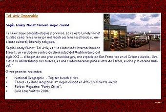 Según Lonely Planet, Tel Aviv, es " la ciudad más internacional de Israel... un verdadero centro de diversidad del Mediterráneo del siglo XXI ... el hogar de una gran comunidad gay, una especie de San Francisco en el Oriente Medio… Gracias a su universidad y sus museos, es una ciudad mecenas para el arte de Israel, el cine y la escena musical. "