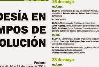 Muchos recitales previstos para mañana viernes. Así que empezaré por Vicente Muñoz Álvarez y Jorge M. Molinero. Estarán ambos, compartiendo mesa, a las seis y cuarto de la tarde, en los encuentros Poesía en tiempos de disolución, en la Universidad de Valladolid: