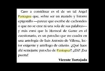 Yo no le conocí personalmente, ni hablé de él con ninguno de los amigos más o menos cercanos que sí le conocieron y trataron. Por eso nunca he hablado de él ni voy a hacerlo ahora. El único motivo de traerlo aquí es la casualidad de haber encontrado en Google libros la vista previaRenacimiento (1997 - vol.II) donde apareció una de las reseñas (firmada por él y a la que pertenece el párrafo de la fotografía) que se hicieron a 10 menos 30, la antología de L.A. de Villena en la que (ya no sé si decir que por suerte o por desgracia) fui uno de los seleccionados. Un viejo recuerdo, en fin, del que no tenía copia en papel (aunque la reseña en cuestión fue recogida después en Azahar y vitriolo, uno de esos habituales volúmenes recopilatorios de este tipo de escritos). del número nº 17-18 de la revista No fue, desde luego, la única "alegría" que me deparó esa antología (tiempo habrá de comentar algunas otras), pero sí una de las más "sonadas"... Las preguntas obligadas son, claro, en primer lugar, ¿por qué la imagen de esta entrada no es una fotografía de la persona cuyo nombre la encabeza?; y en segundo lugar, si he dicho por adelantado que no le conocí ni voy a hablar de él... ¿por qué la encabeza su nombre...? Sencillo: porque para mí Vicente Tortajada (que hasta ese momento —finales del 97 o principios del 98— era un señor que había publicado una traducción de los Sonetos de Crimea de Adam Mickiewicz) es desde entonces ese párrafo, esas palabras le retratan mejor que cualquier fotografía.
