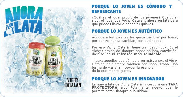 Con la nueva lata de Vichy Catalán, la empresa pretende buscar nuevos públicos y nuevos momentos de consumo (en la playa, en la montaña, en el gimnasio, en la pista de pádel, en el césped del parque, en la piscina, en la universidad, en los conciertos o en las excursiones, el coche o la bici ...). La lata se ha concebido pensando en un target de público joven que da mucha importancia a la calidad del producto y a la marca, y quiere refrescarse en cualquier lugar o momento de una forma sana y natural. Este target está formado básicamente por hombres y mujeres jóvenes de 16 a 35 años con un estilo de vida urbano y al mismo tiempo saludable.En el sector de las latas, donde ya están presentes otras categorías de productos como los refrescos y las cervezas, la nueva lata de Vichy Catalán pretende posicionarse como el refresco más saludable. El lanzamiento de Vichy Catalán en lata responde a una estrategia empresarial muy concreta, de diversificación de productos, y a la necesidad de vender por otras vías diferentes a las tradicionales de la marca, ligada desde sus inicios hace más de 130 años al envase de vidrio.