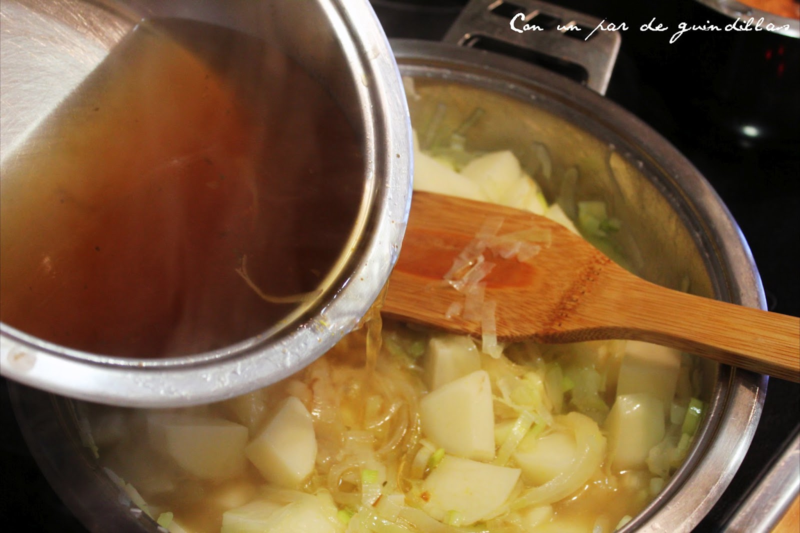 Elaboración: 1.- Pelamos y lavamos las patatas y las cortamos en dados. Picamos el puerro y la cebolla en juliana. 2.- En una cazuela derretimos la mantequilla y sofreímos la cebolla. Cuando esté transparente añadimos el puerro y rehogamos el conjunto unos 10 minutos.