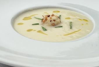 El método de cocción que he utilizado es el mismo para todas, sustituyendo al final de la cocción las diferentes frutas, pero ya iremos poniendo cada receta. Vamos a empezar con la vichyssoise de peras a la que le hemos añadido unas bolitas de dos quesos rebosadas en almendras. Le da un toque crujiente al plato y un constraste de sabores.