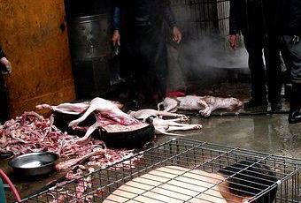 Pian Shankong, un artista de performance de 40 años de edad, se pone en cuclillas en ropa interior dentro de una jaula de perro delante de un carnicero de perros en un mercado al por mayor en Guiyang ciudad, capital de Guizhou, suroeste de China, el 19 de Diciembre de 2011, instando a la gente a no comer perros. Desde el año pasado, ha viajado por todo Pian, muchos lugares de Yunnan y Sichuan en el suroeste de China para pedir al público que amen y respeten a los animales.