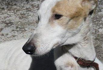 Su vida ha sido nacida para cazar, comida un triste pan duro y agua, sin cariños, mimos, ni una triste caricia y una dulce palabra, a medida que paso sus tres cortos años para ella una eternidad, cuando se acabo la época y VIDA no servia, tuvo encima suerte de ser abandonado, no colgada en un arbol. Deambulaba dando tumbos con su esqueleto cuerpo y sus patas sin fuerza por la A3 para morir atropellada. Pero eso no fue así , se cruzo su Ángel de la Guarda, que no dudo en correr el riesgo por las dos y parar y cogerla. No os podéis hacer la idea como estaría que no dudo en acercarse aquella mano amiga que le decía que ya se acabo.