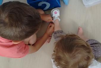 In one of my firsts posts I showed how Alejandro put his slippers on his own, and now here he is putting sandals on his sister’s feet, who as you can see, is not missing detail of the process!