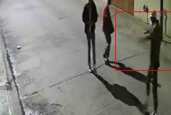 Las imágenes muestras a un sujeto de complexión débil acompañado de un gordo, quien saca de sus ropas un arma corta con la que amedrenta a una pareja de jóvenes que venían caminando por la mitad de la calle.