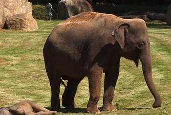 Más tarde un cuidador se acerca y levanta por atrás al pequeño elefante logrando que este despierte y acuda con su madre. La elefante no parece molestarle el hecho de que el cuidador intente despertar la pequeño si no todo lo contrario siente la toda la confianza del mundo para dejar que se acerque y le ayude a despertarlo.