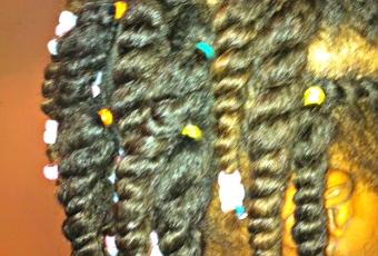 Cuando acabo con un cuarto delantero, sigo con el otro; y después, en los dos cuartos traseros, en vez de hacer flat twist, hago twist, y los fijo con tres beads (bolitas), y una gomita -nota mental: acuérdate de comprar los snaps en Mi tienda de pelo afro-.