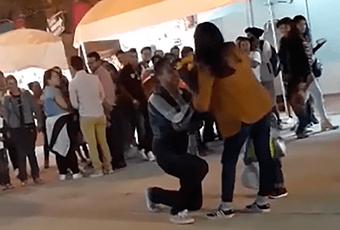 Con porras la gente comenzó a pedir primero un beso por parte del hombre y la mujer. Luego cuando la solicitud de matrimonio fue realizada, las personas comenzaron a animar a la mujer a decirle que sí, y tratar de volver emotivo el momento. Sin embargo por razones personales de la mujer, esta decidió no darle el sí al hombre, para posteriormente abandonar el lugar.