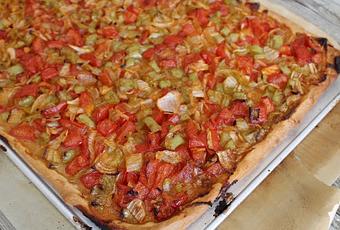 MODO DE PREPARACIÓN DE LA MASAPonemos en un bol las dos medidas de aceite y de cerveza le ponemos sal y lo removemos y mezclamos y disolvemos la manteca.Una vez disuelta vamos añadiendo la harina hasta que se nos quede una masa blanda y elástica, amasar un poco y reservar mientras preparamos las verduras, si ya están preparadas, simplemente untar la bandeja con un poco de aceite de oliva, estirar la masa con un rodillo y acabar con las manos, agarrarla bien a los bordes y retirar el sobrante.Pintar con la mezcla de pimentón, aceite, sal y pimienta con un pincel la masa y hornear durante unos 10 minutos a 200 grados, dependiendo del horno.Sacarla y colocar las verduras por encima sazonadas y estrujadas para que no estén demasiado acuosas ya que el tomate suelta mucha agua y colocar bien por encima de la masa.Terminar de hornear por la parte de abajo a unos 180 grados durante unos 15 minutos y luego por arriba y por abajo otros 15-20 minutos dependiendo del horno, esto es muy relativo, cada horno es distinto y cada uno conoce el suyo, este es el tiempo que yo tardé en el mío, pero siempre es buena idea ir mirándola que esté cocida por abajo y que haya hecho lo que se dice en mi tierra “suela”.