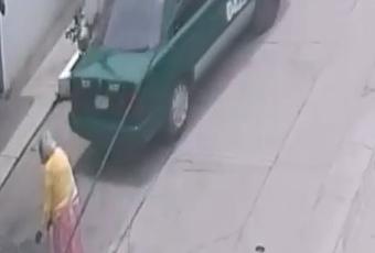 En el vídeo se ve como la mujer tras bajar y ver que el taxi arranca para darse a la fuga con los objetos robados, ésta comienza hacer señas e intenta dar alcance, sin embargo poco puede hacer debido a su avanzada edad y que tiene dificultades para caminar pues requiere de doble bastón para poder apoyarse.
