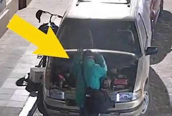 La cámara captó a un sujeto a boro de una bicicleta quien venía caminando sobre la acera cuando se apostó a un lado de una camioneta y logró manipular la chapa para abrirla. Al subir al vehículo busco la palanca para lograr abrir el cofre del vehículo.