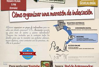 Seguramente el término Indexación os va sonando más que hace unos días atrás. Hace unos años llegó a mis ojos (a través de google) la noticia sobre Indexa-manía o Indexatón y me preguntaba de qué se trataría... Por eso mismo es que este viernes tengo a tres invitadas que nos contarán su experiencia con maratones en sus países y nos enseñarán cómo se organiza esta clase de actividad. Muchos de vosotros me habéis escrito diciendo que os gustaría indexar en grupo y qué mejor manera de comenzar a hacer las cosas bien que aprender de quienes ya han organizado este tipo de eventos. Id preparando las preguntas para el viernes 25 que tendremos buen material.
