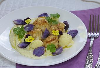 Me encantan las vieiras qui por aquí llaman “coquilles de Saint-Jacques”. Es un marisco de lujo que no se puede uno permitir muy a menudo. No había pensado cómo acompañarlos, compré coliflor y con las patatas azules que hemos recolectado del jardín ha quedado un plato de lujo. Buenísimo. Las vieiras combinan muy bien con la crema de coliflor. Esta crema totalmente sin lácteos, está preparada con un poco de caldo de pescado hecho en casa. Las patatas azules, unos pensamientos y un poco de cilantro para decorar y un buen chorro de aceite de oliva virgen extra … precioso, ¿verdad?
