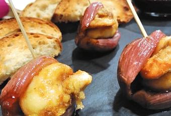 Abrir las chalotas e introducir una vieira en cada una de ellas, sujetarlas con una brocheta y regar con una cucharadita del glaseado.
