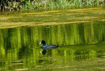 Esta charca también ha conocido mejores días en lo que a avifauna se refiere, aunque en otros aspectos es un valioso enclave natural. Hoy sólo pude ver una gallineta aparte de esta pareja de fochas, que aparentemente no tenían pollos. Puede que no críen todos los años, pero permanecen fieles a la charca, esperemos que por mucho tiempo.