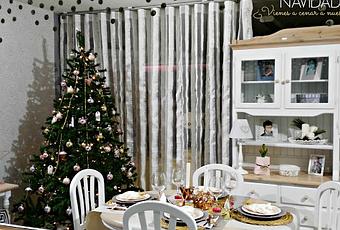 La base del escaparate no son muchas piezas: una gran alacena, una mesa redonda con cuatro sillas y un mueble auxiliar que, en este caso, vamos a utilizar para crear un rincón especial, todo ello mezclando el blanco con la madera. Por supuesto, el complemento indispensable es nuestro árbol de Navidad.
