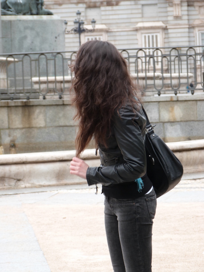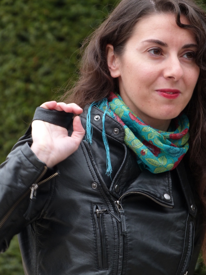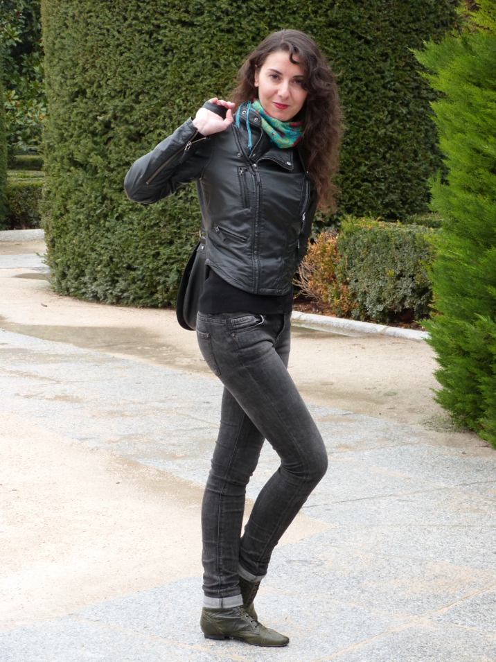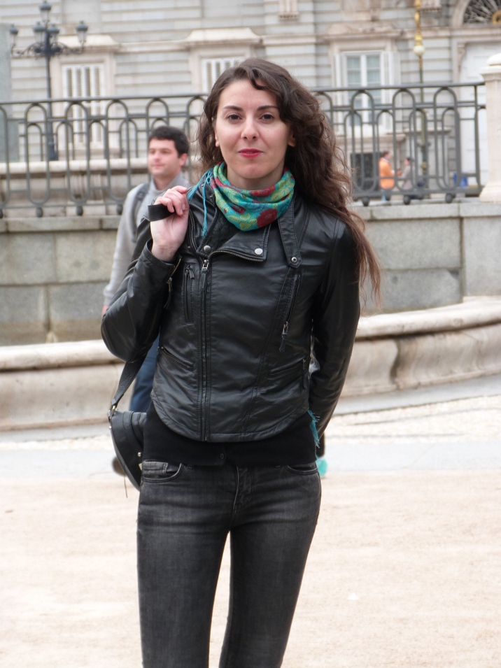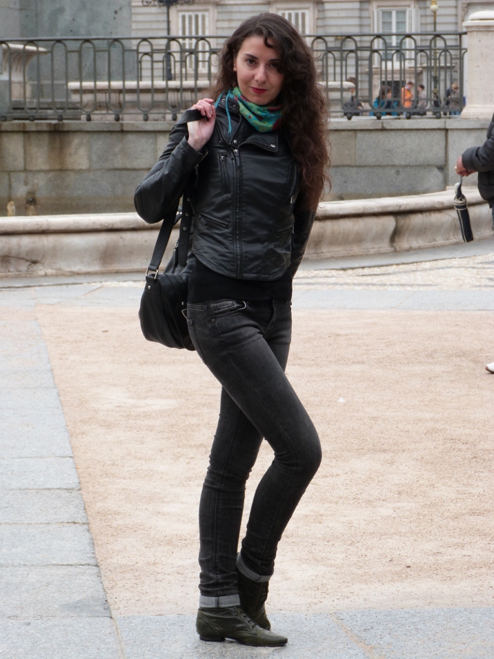 En noviembre vino a Madrid a hacerme una visita y me gustó mucho su look, muy característico de ella.Pantalones pitillo y perfecto de cuero. Aportando color con su pañuelo tipo mantón de manila y sus labios rojos. ¿Lo que más le gusta a ella de su look? Las botas, las compró en Colombia en uno de sus viajes y dice que son muy cómodas.¡Perfecta para un día de visitas y compras!