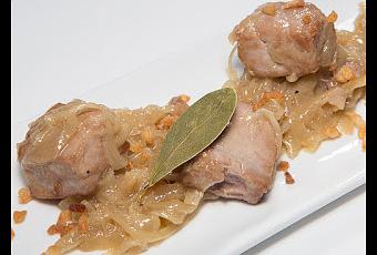 500 gramos de atún rojo 800 gramos de cebolla 100 mililitros de aceite de oliva 10 gramos de ajo 10 bolas de pimienta negra 1 hoja de laurel 1 clavo de olor 1 toque de tomillo 100 ml de vino blanco Sal
