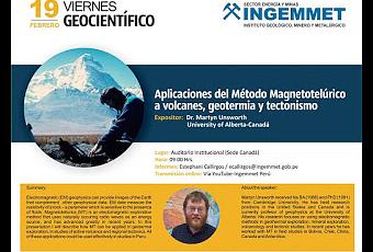 Este viernes 19 de febrero de 2016 en el Auditorio del Ingemmet (4to piso)se presentará el tema: Aplicaciones del Método Magnetotelúrico a volcanes, geotermia y tectonismo. El expositor es el Dr. Martyn Unsworth de la University of Alberta - Canadá. Hora: 09:00 am. Ingreso LIBRE.