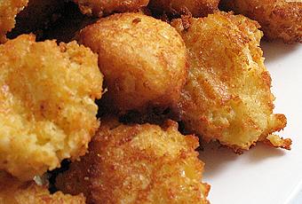 Calienta el aceite en una sartén o una cacerola (necesitarás suficiente para cubrir la base con aprox. 4cm de profundidad). Forma bolas pequeñas de la masa, de aprox. 1,5cm de diámetro, y cúbrelas con migas de pan. Fríelas en el aceite caliente hasta que se hinchan y cojan un todo dorado. Claro, habrá que probar algunos mientras sigues con los demás… Sirve enseguida.