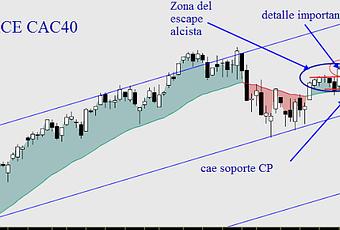 Pues básicamente hemos tenido una figura de Fallo & Giro: el CAC ha roto una resistencia de corto plazo, para acto seguido, romper un soporte, también de corto plazo. Es decir: "ups, por aquí no, mejor por aquí".Es un análisis simple pero poderoso del precio. A partir de aquí, hay que destacar especialmente que se trata de un F&G de corto plazo. Tanto la resistencia como el soporte perforados, se formaron en la semana previa, lo cual no nos permite adelantar una gran debilidad duradera, aunque nunca se sabe una vez que ha prendido la mecha...