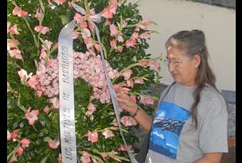 Ada Rodríguez, hermana del copiloto Ángel Tomás despliega la cinta de la ofrenda floral colocado en el Parque de los Mártires en Ranchuelo. Belkis Pérez Valdés, prima de Wilfredo (Fello), denunció al imperialismo que ampara al terrorista confeso Luis Posada Carriles. Conmovieron los versos que Estela Ávalos Pérez compuso hace tres años para su primo Fello, declamados a dúo por dos estudiantes del preuniversitario que lleva el nombre del valeroso piloto del vuelo CU 455.