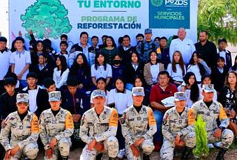 En la jornada participaron estudiantes de la Telesecundaria Margarita López Portillo, elementos de la Guardia Nacional y representantes de la empresa Petroquímicos de Aceites, quienes colaboraron en las labores de plantación.