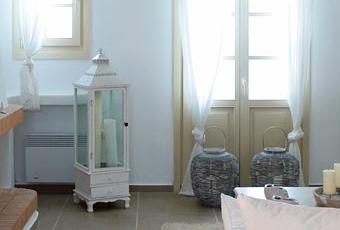 La villa esta construida con piedra y estructura de maderos, paredes pintadas, chimenea y una armonia increible, con el tradicional estilo rustico de las Cicladas