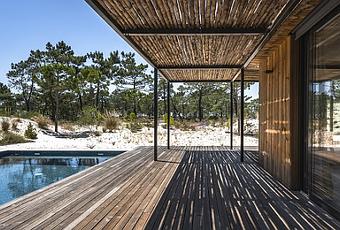 Casa rustica y moderna, disenada en estilo natural actual, en medio de las dunas, del hotel Pestana Troia Eco Resort And Residences, en la Peninsula de Troia, un sitio paradisiaco de Portugal.
