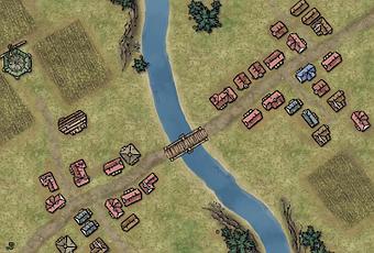 Village - Stock Map, de J.F de los Reyes es un mapa genérico y gratuito (Antes tenia precio fijo pero es de descarga libre) que representa una pequeña población a largo de un camino y dividida por un río. Vale para usar en cualquier tipo de juego de rol y el autor permite tanto licencia de uso personal como de uso comercial (Aunque en este segundo caso, hay unas condiciones a cumplir previamente.mas bajo se ven).