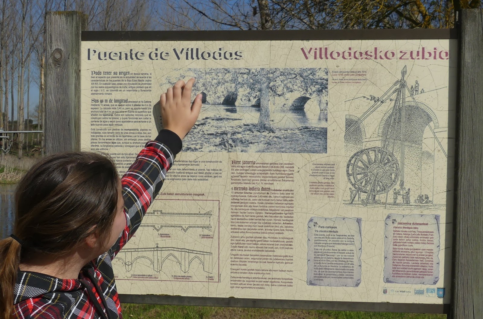 Silvia conociendo curiosidades sobre el destacado puente de Víllodas.