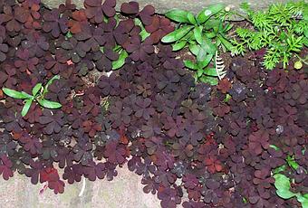 Hojas alternas, digitado-trifoliadas, folíolos anchamente obcordados, laxamente pubescentes, de 8 a 20 mm de longitud por 6 a 8 mm de ancho, de color purpúreo a borravino.