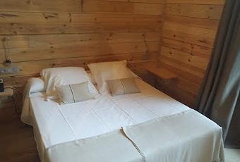 Entre Sabiñánigo y Biescas, a las puertas del Pirineo Aragonés, y con unas vistas espectaculares de las montañas cercanas, en una finca compartida con dos preciosas ermitas románicas se levanta de nueva planta este chalet de montaña, de dos alturas, construido mayormente en cristal y madera. Ubicado en una ladera, hemos de acceder al jardín desde una verja automática corredera que nos abren desde recepción tras llamarles desde un interfono ubicado junto a unos arbustos. Fuera llueve fuerte, y desde recepción nos indican que subamos con el coche hasta la puerta. Nada más pasar la verja metálica encontramos a la derecha un largo (y algo desordenado) aparcamiento sobre gravilla. Al fondo del mismo una casa típicamente aragonesa con un espectacular huerto.