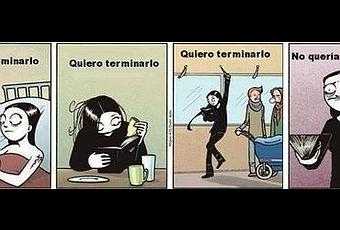 Seguro que todos os habéis sentido identificados con esta viñeta en alguna ocasión, especialmente cuando tenemos entre las manos un libro que nos está encantando. Entonces, nuestros ojos, voraces, vuelan sobre las páginas, como aves de rapiña, y devoran las letras con fruición, sin tiempo para saborearlas, porque no, no hay tiempo. El ansia nos corroe. Necesitamos saber más acerca de la historia, así que nos abalanzamos sobre el libro a la menor oportunidad, devorando una página tras otra sin prestar atención a la pluma, demasiado centrados en el tuétano de la trama. No nos importa comernos las comas y los puntos con tal de ir más deprisa. Solo tragamos palabras y palabras, que no hacen más que alentar el hambre que nos asola. Entonces, llegamos al punto y final, y nos embarga la desazón, pues aún no estamos saciados. Solos nos queda picotear los restos, volver a leer la historia, ahora con más atención, o poner el ojo en nuestra segunda víctima, en caso de que el libro tenga continuación.El último libro con el que me ha pasado es con La princesa prometida, de William Goldman. Era una relectura, por lo que aquello que me empujaba a seguir leyendo no era descubrir cómo iba a continuar la historia, sino mi ansia por seguir sorprendiéndome ante el ingenio narrativo del autor y para seguir riéndome a carcajadas con su peculiar forma de contar las cosas y su imaginación.No os podéis hacer a la idea del vacío que me dejó cerrar la última página, y eso que mi edición aniversario cuenta con varios materiales extra, como un epílogo y el primer capítulo de una hipotética novela que nunca se escribió (el autor lo incluye simplemente para frustrar a sus lectores, pues nunca tuvo intención de escribir una continuación). Quedé con tantas ganas de leer más cosas del autor, lo que fuera, que me apropié de la edición aniversario de G (la suya tiene más contenido extra, pero la mía es más bonita) y me leí la entrevista a los personajes que incluye esa versión. Y me dio completamente igual que estuviera en inglés. ¿Cuál fue el último libro que leísteis con desesperación y que os dejó con un vacío al terminarlo?