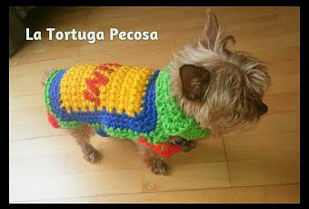 El traje está hecho a doble lana, para que sea más calentito, realizado a cuatro colores: rojo magenta, verde tortuga, azulón, y amarillo plátano. La parte del cuello queríamos que fuese cuello doble para que dentro de que esté cçómodo pero le abrigue a la vez y se sujete de manera justa.Le deseo desde aqui que tenga los más bonitos y dulces sueños caninos, y que él ya lo sabe pero que le quiero un montón