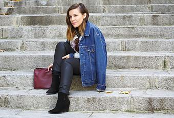 Salut les filles! Je vous montre aujourd'hui ce look avec ma veste préférée, en denim, elle était à mon frère mais ilne la porte jamais, donc c'est pour moi! Je l'ai combinée dans ce look où prédomine les bleus et noirs, j'aime beaucoup tousles deux ensemble. Ce type de pull es parfait pour apporter une touche sportive à notre tenue, j'ai choisi celle-cipour pouvoir combiner ces accessoires en bordeaux. Ça vous plaît ce look pour commencer la semaine?Bisous!