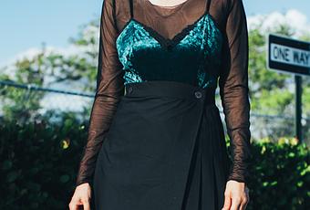 Surfing through ebay is one of my favorite hobbies, to spend time scrolling through vintage or one-of-a-kind product auctions… one of those days I found this vintage velvet bodysuit and I really like the way it fits on the top. I wore it with my american apparel pleated skirt, a sheer top underneath from Boodwah and black boots.