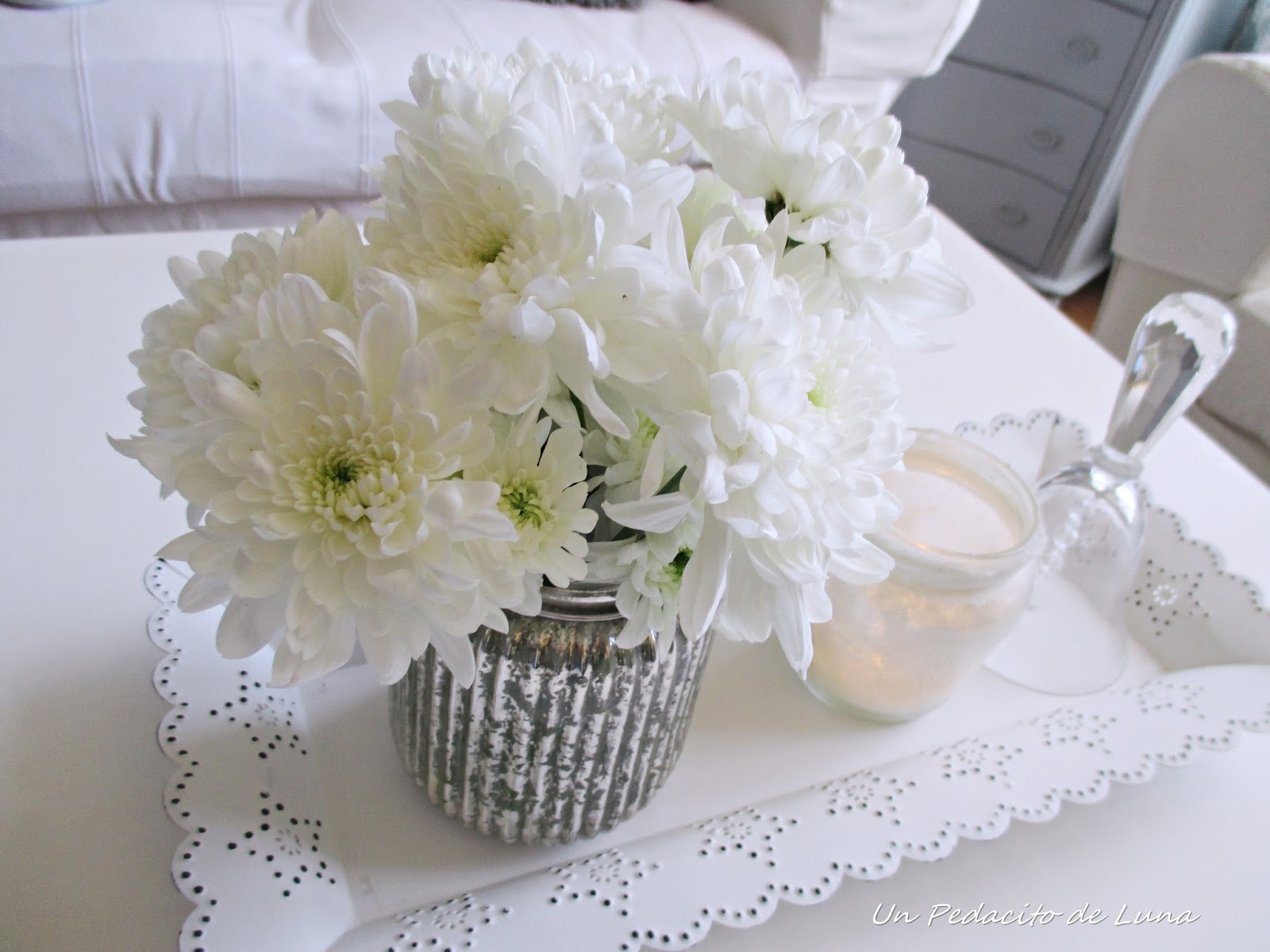 Y aunque puede tener varios usos, enseguida la visualicé con flores, en este caso, unos crisantemos en dos tonos dispuestos en vasitos de cristal, una nota de color que inundase el espacio y me contagiara su alegría.