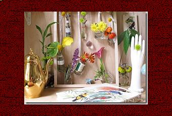 Aprovecha una estantería para colgar pequeños frascos y botellas de las que habitualmente tenemos en casa, de conservas, salsas, perfumes…La composición floral que crea queda maravillosamente bien.