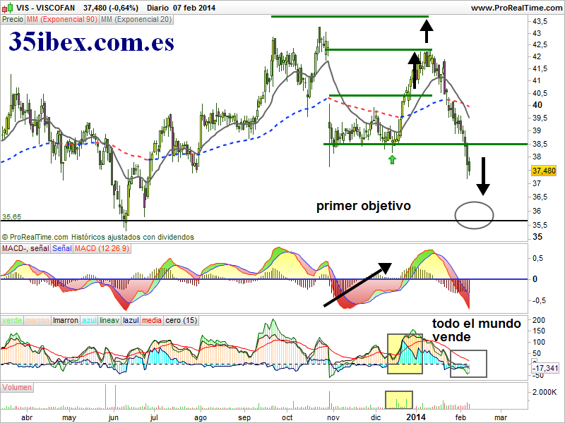 Si Viscofan pierde la zona 35.64, activaría un doble techo con objetivo en los 28 euros, zona que antes fue resistencia y que ahora podría actuar como soporte.